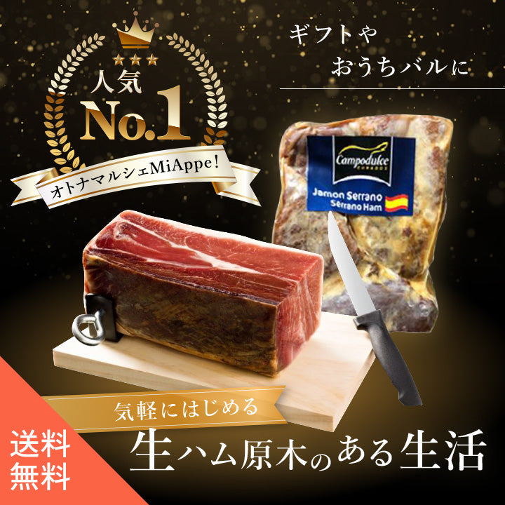 16ヶ月熟成させたパレタセラーノ約4.5kgと、生ハム台やカットナイフなど生ハム生活に必要な道具がセットになっています。
